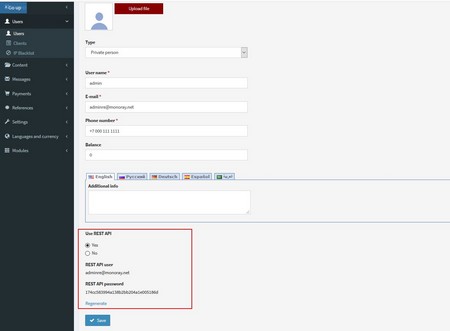 For using methods REST API turn on the module in the section "Settings" -> "Modules management ". Also check to option "Use REST API" is available to the user. You can activate or deactivate the use of REST API for a user in the admin panel when editing a user.