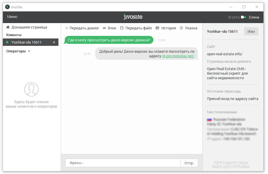 Мы пользуемся чатом JivoSite 2 года и приняли более 20000 диалогов. Наши операторы получили множество оффлайн-сообщений и сохранили всю летопись нашего общения с клиентами - логи чатов приходят на почту. Чат JivoSite - отличная альтернатива Skype. При желании в программе можно включить опцию приема звонков. Мы всегда знаем, откуда приходят наши клиенты. JivoSite определяет местоположение клиента по IP, и вы увидите, из какой страны и города поступил запрос на общение.